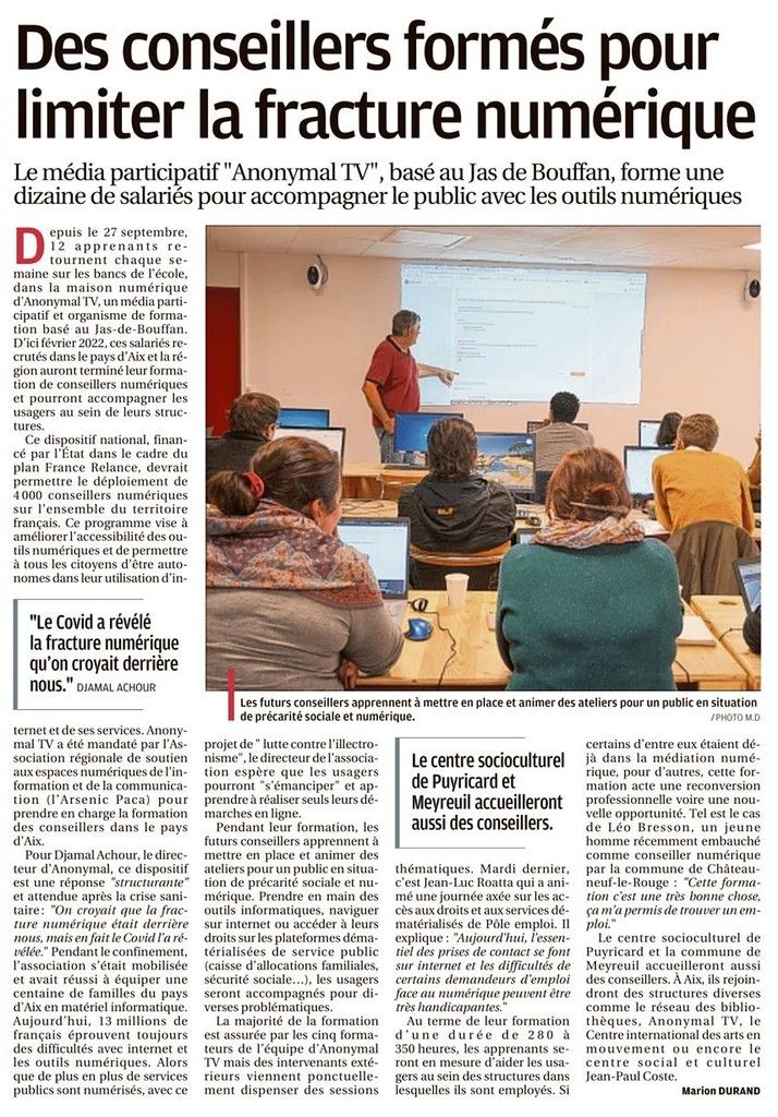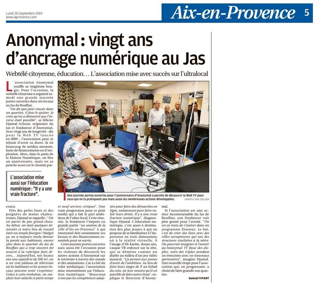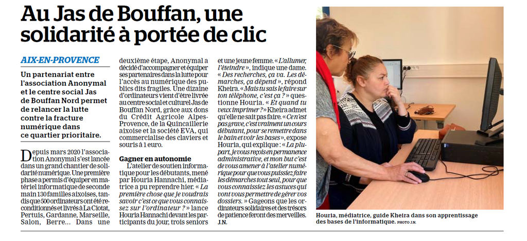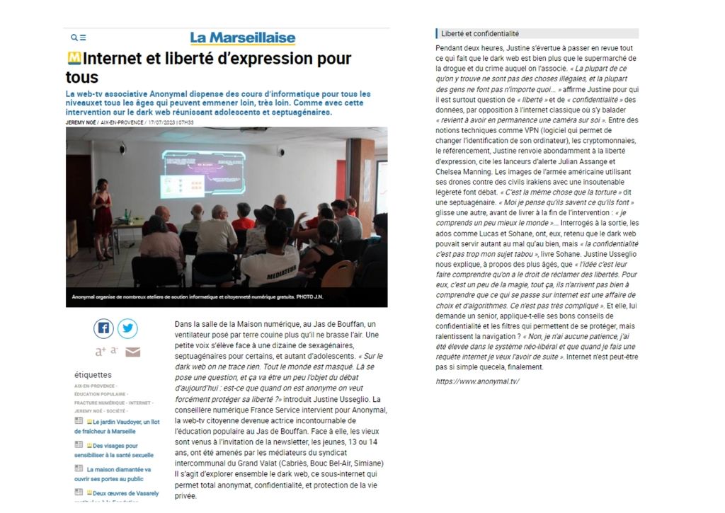 Depuis des années, Anonymal agit sur le pays Aixois et ses alentours. De par nos projets, nos actions en centre sociaux mais aussi dans nos locaux du Jas de Bouffan, Anonymal et La Maison Numérique ont été largement médiatisés dans les journaux locaux et régionaux. Nous sommes fiers de partager avec vous toutes les publications qui ont été réalisées sur nos actions et nos projets, et de vous donner un accès facile à ces articles grâce à notre Pearl Trees.