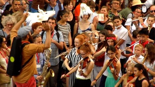 Parade du Festival d'Art Lyrique d'Aix-en-Provence, le 24.06.2018 sur le Cour Mirabeau. Les gens ont pu défiler avec les créatures qu'ils ont pu réaliser lors des ateliers de création au Château de l'Horloge.